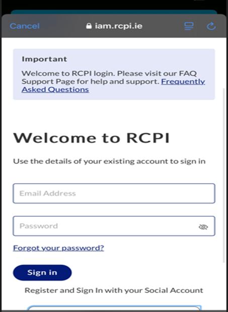 - Select organisation: “Royal College of Physicians of Ireland” (You might have to type the name for the app to find the entry so that you can select it)