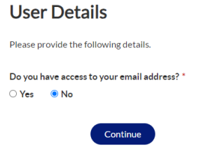 3. You will be asked if you have access to your email address. Please select the 'No' option and click Continue