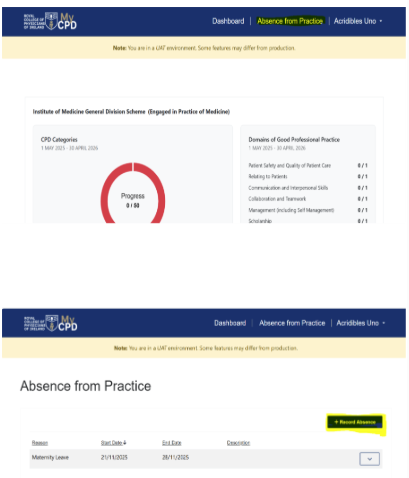 - Click on the “Absence from Practice” button in the top right corner (next to Dashboard).